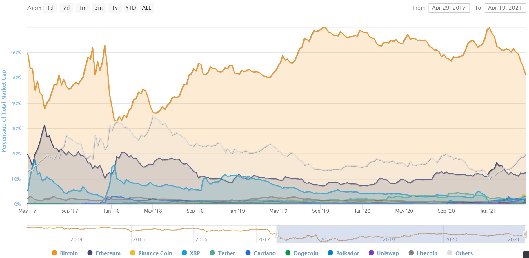 Biểu đồ thể hiện thị phần trên CoinMarketCap cho thấy rằng tính đến hôm nay, thị phần của Bitcoin trong tổng vốn hóa thị trường tiền điện tử chỉ đứng ở mức 50,1%.