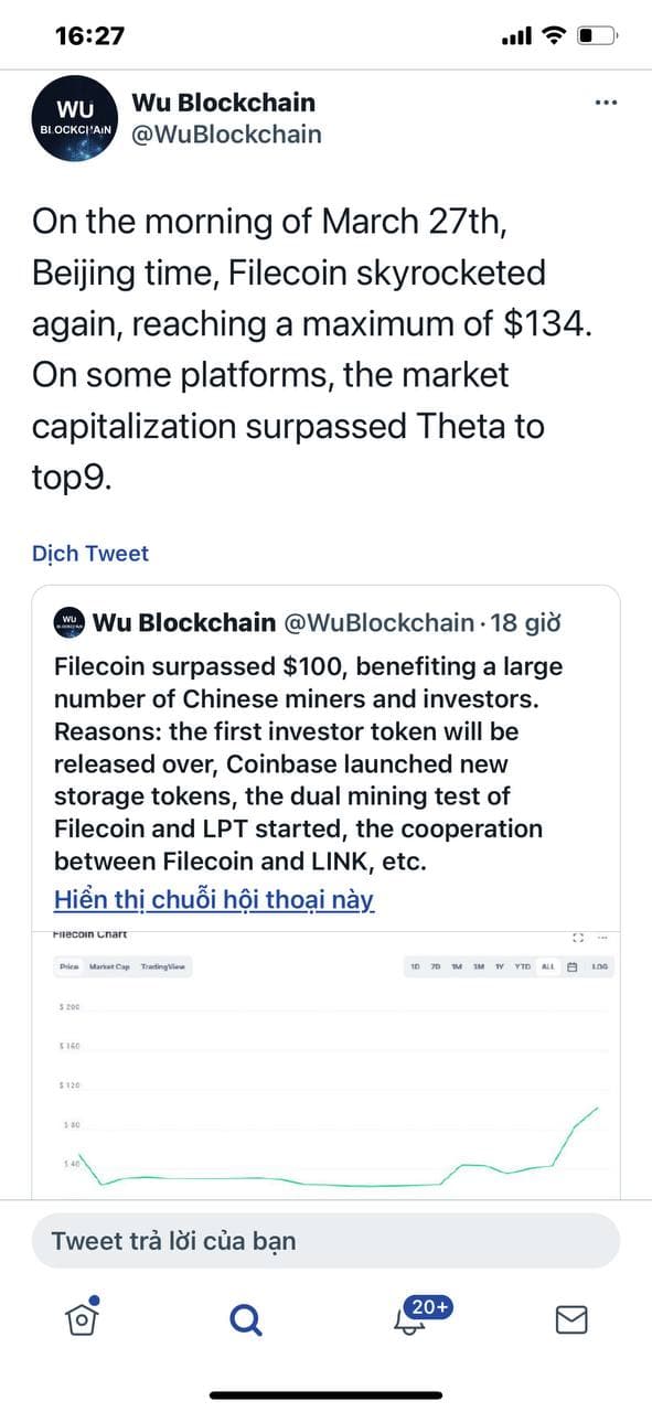 Theo nhà báo nổi tiếng trong ngành blockchain đến từ Trung Quốc Colin Wu, trên một số công ty tổng hợp dữ liệu, FIL thậm chí đã vượt qua Theta theo vốn hóa thị trường. Tài sản thứ hai đã lọt vào danh sách mười tài sản tiền điện tử hàng đầu vào tuần trước.